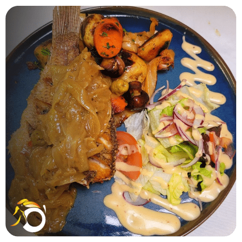Savourez le Yassa Poisson, un plat africain traditionnel aux saveurs citronnées, servi avec riz blanc ou attieké.
